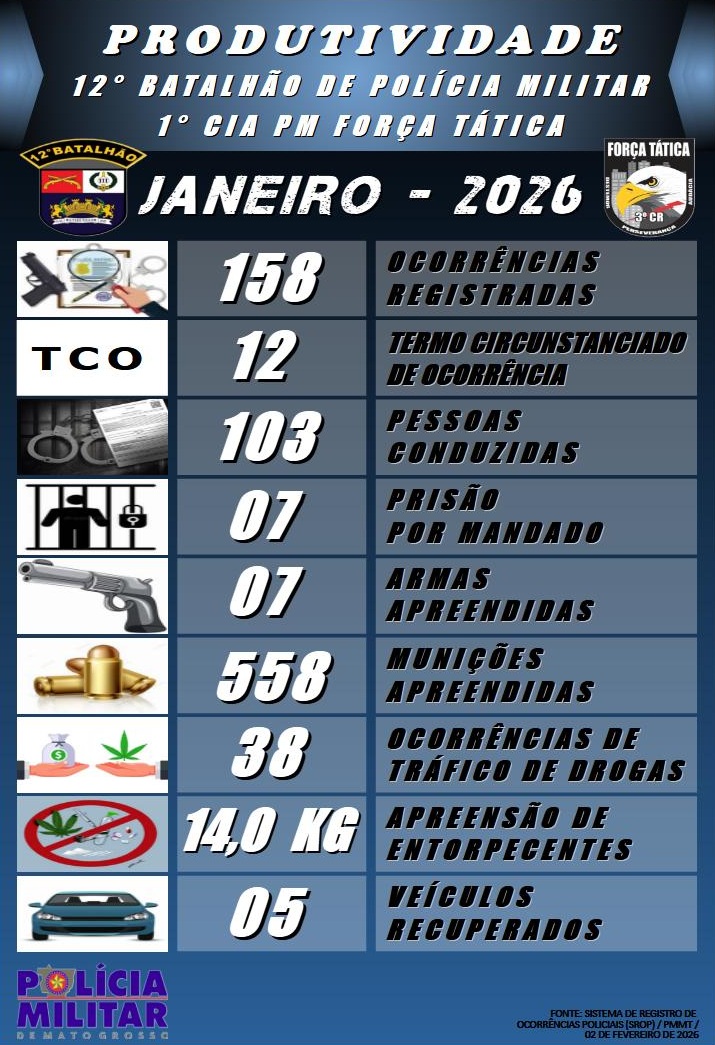 O 12º Batalhão de Polícia Militar e a 1ª Companhia de Força Tática do , em Sorriso, divulgou o balanço de produtividade referente ao mês de janeiro de 2026. No período, foram registradas 158 ocorrências, além da lavratura de 12 Termos Circunstanciados de Ocorrência (TCO).