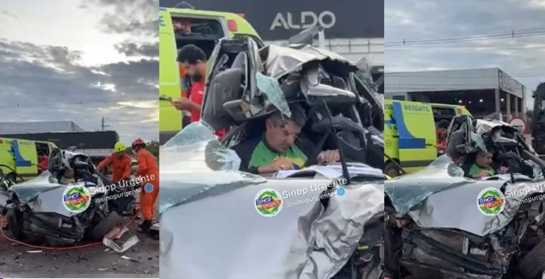 O motorista de um Hyundai HB20 sobreviveu a um grave acidente registrado na manhã desta quinta-feira (5), na BR-163, em Sinop (500 km de Cuiabá). A colisão envolveu ainda um caminhão carregado e uma carreta, no km 827 da rodovia.