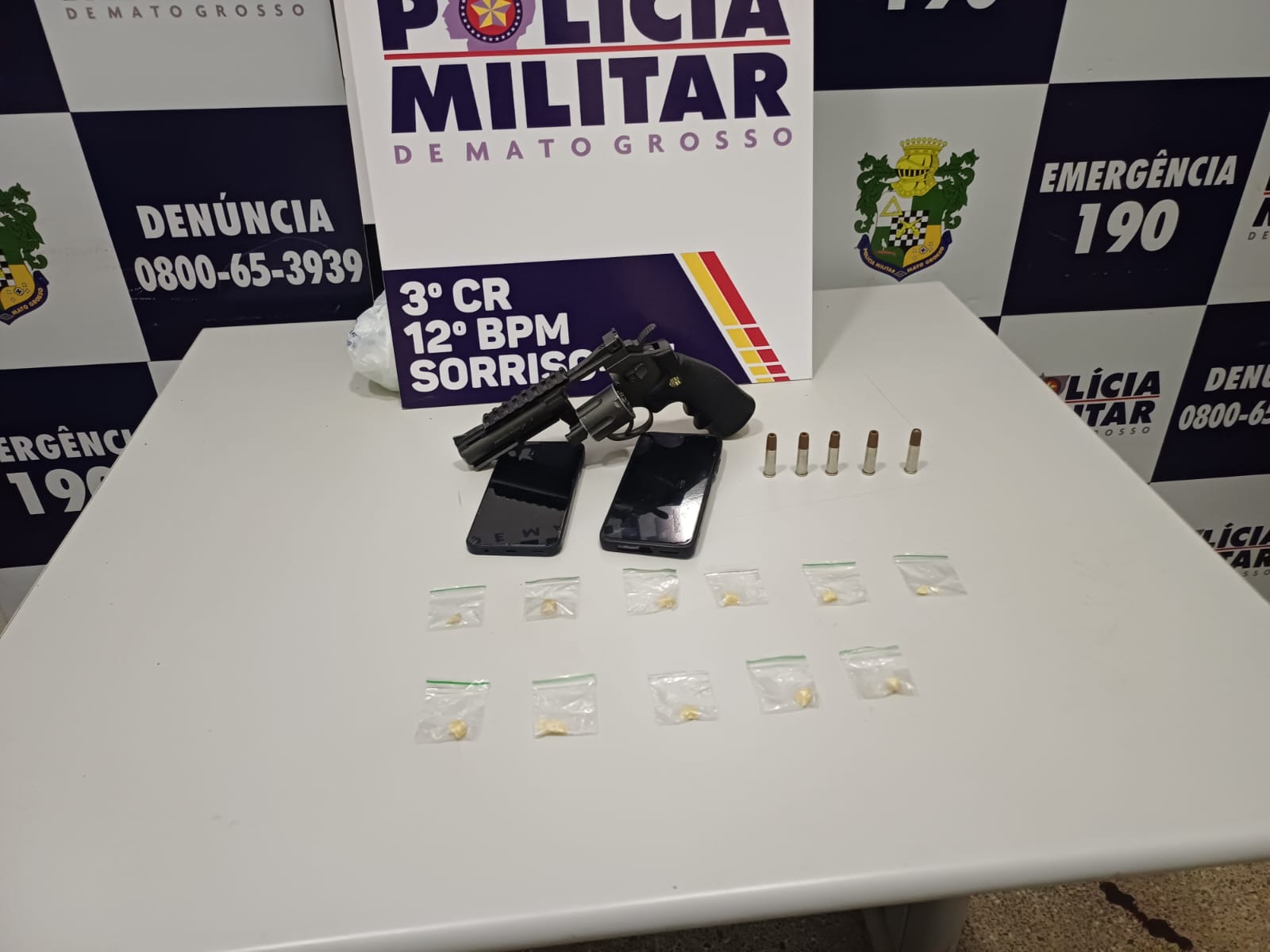 Uma ação da Polícia Militar resultou na apreensão de entorpecentes e de um simulacro de arma de fogo durante rondas ostensivas realizadas na madrugada desta terça-feira (27), em um ponto já conhecido pela intensa movimentação relacionada ao tráfico de drogas, no município de Sorriso.